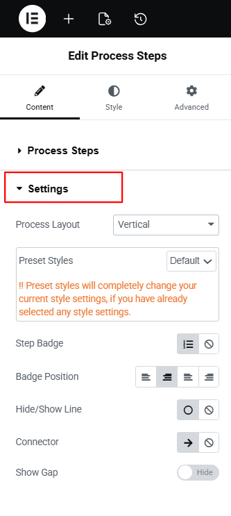 Settings: This section lets you customize the appearance of your Process Steps Timeline. You can choose different layouts and style them according to your website design.