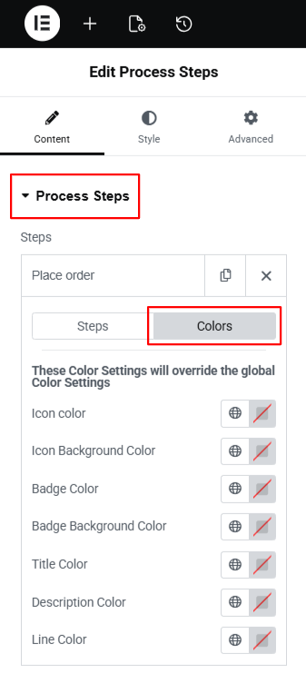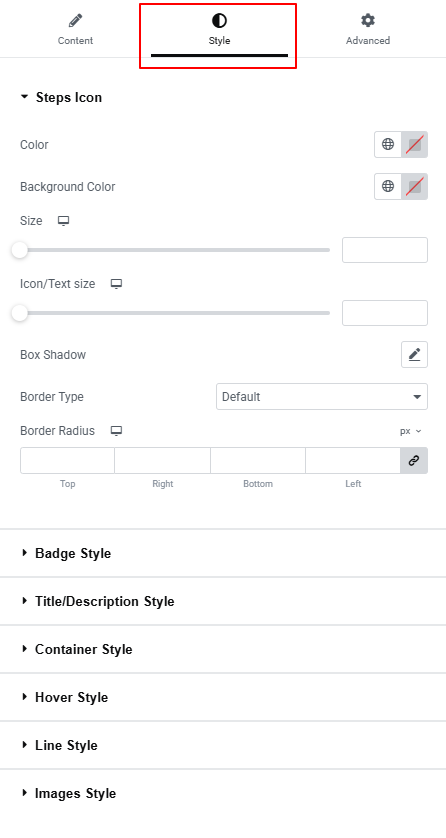 - Step Icon Settings: Customize the icon’s color, background color, icon size, text size, box shadow, border style, border width, border color, and border radius.