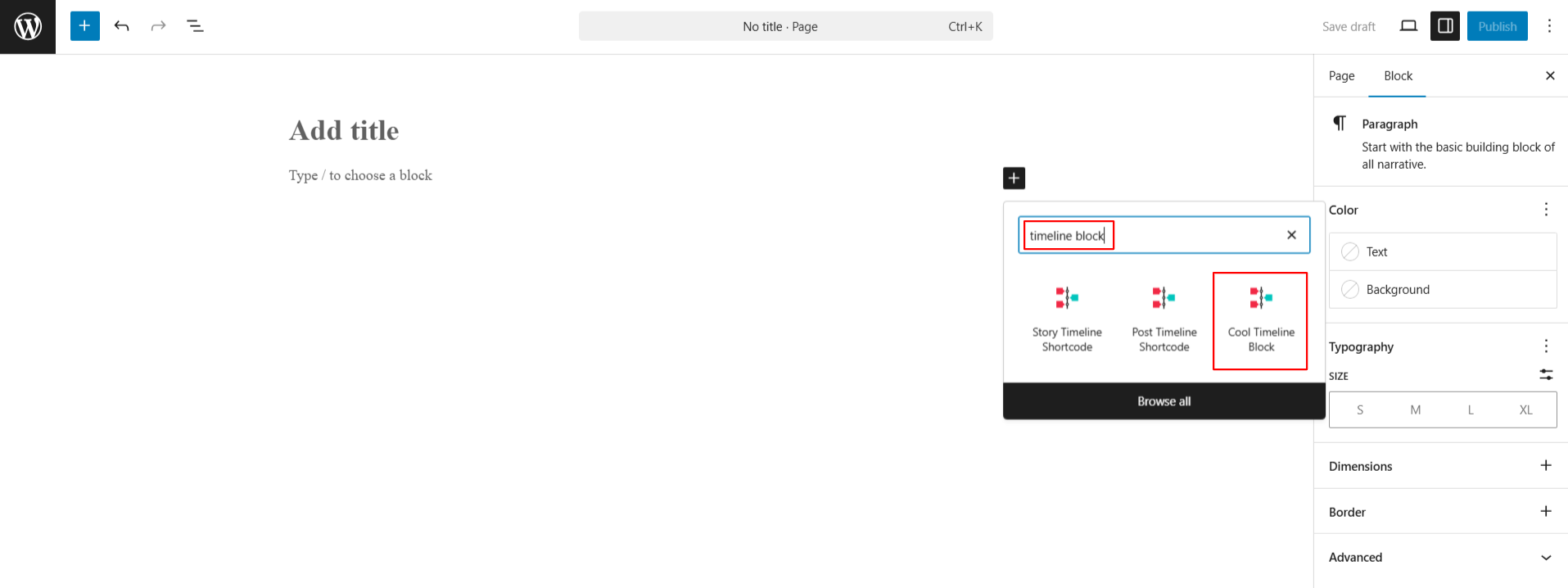 • Now, from the blocks section, search and add “Cool Timeline Block” to your page.
