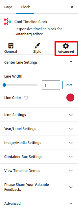 timeline block advanced settings tab