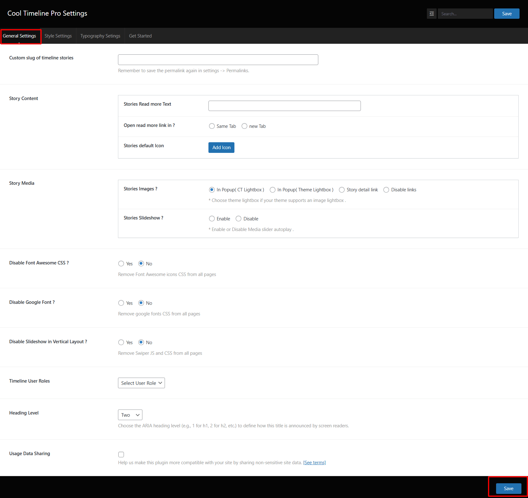 • Disable Font Awesome CSS: If your theme already includes Font Awesome, you can select Yes to disable it in Cool Timeline and avoid duplicate CSS loading.