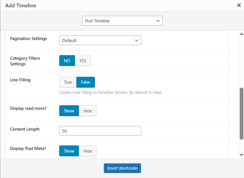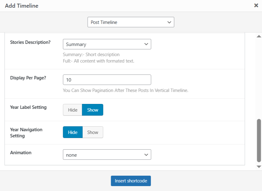 • After adding the timeline shortcode to your page, you can fully customize the display of timeline using the following settings.